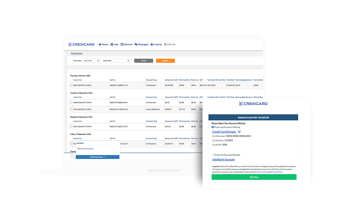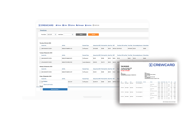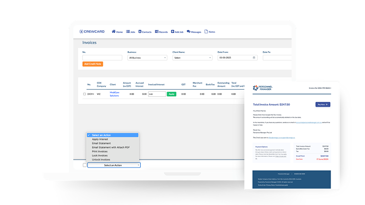 CrewCard lets you email invoice statements (including outstanding balances) to clients directly from the system. There’s a built‑in feature to apply interest to overdue invoices (if configured with payment terms and grace‑period settings), which can help incentivise timely payment. For persistent non-payment, CrewCard offers a “Letter of Demand” feature (or at least the ability to enable one via support), which helps formalise collections for overdue invoices through documented notices.