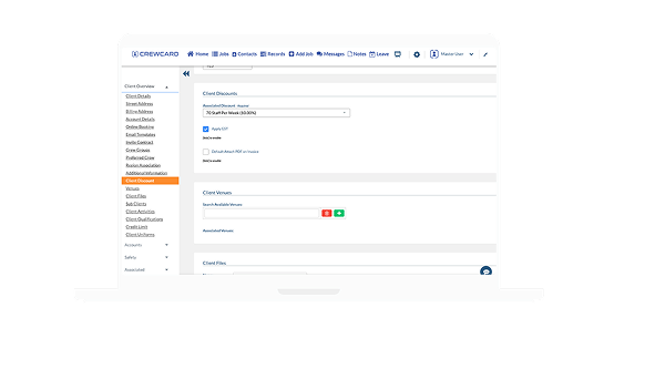 CrewCard supports advanced client-level billing structures, allowing administrators to configure custom rates, charge multipliers, service fees, travel charges, and special pricing rules. Discounts, credit notes, adjustments, and partial charges can be applied within the system, ensuring invoicing remains flexible while maintaining clean financial audit trails.